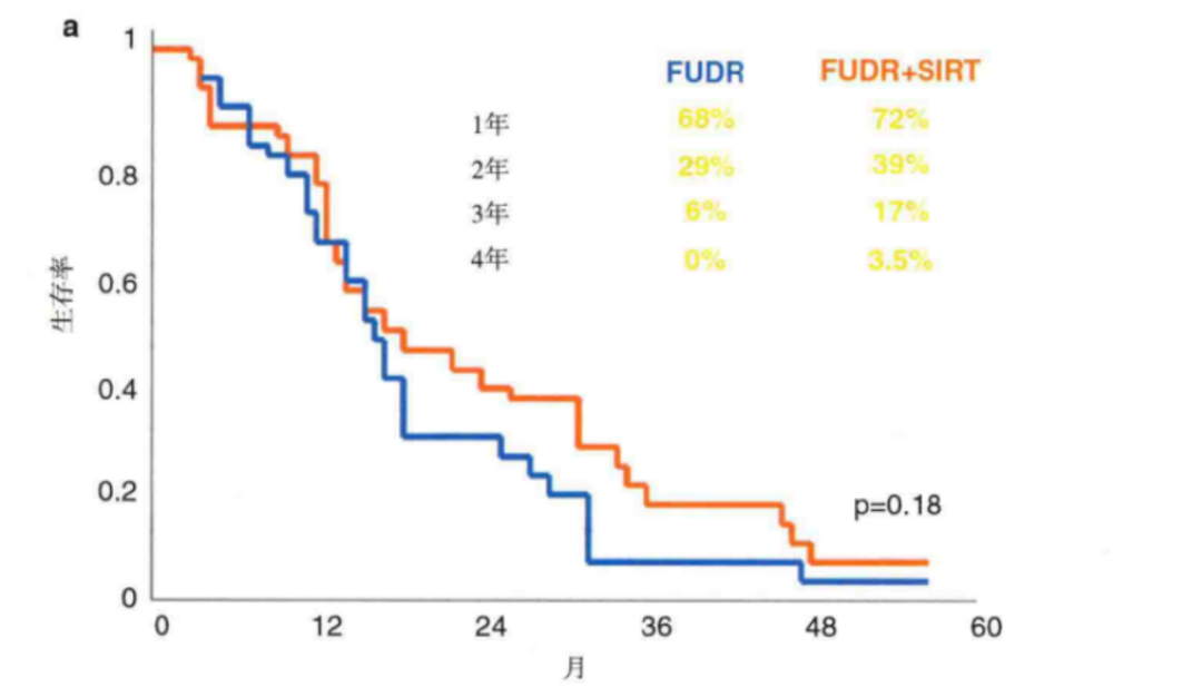 (a)FUDR與 FUDR + RMT Ⅲ期隨機對照研究中的生存(cun)曲線。差異(yi)在第2年和第3年最顯著。由于(yu)肝(gan)外疾(ji)病(bing)的進展,5年生存(cun)率差異(yi)不大。