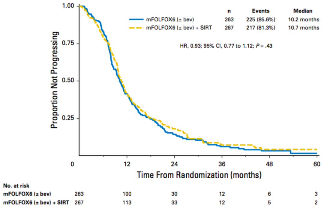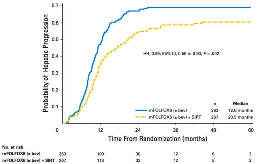 SIRFLOX (SIR-Spheres,一線 FOLFOX6 +放射性栓塞與 FOLFOX6聯合或不聯合貝伐單抗)的結果于2015年在 ASCO 上宣布。(圖9)中位PFS 在各研究中心間無顯著差異(P=0.43),但與正常對照組相比,在有肝轉移患者中,(圖10)PFS有顯著提高(12.6和20.5個月,P=0.002[5]。