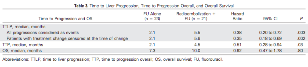 Hendlisz 等進行了一項多中心隨機Ⅲ期研究,對比評估了90Y微球加5-FU 與單純使用5-FU 的效果。全部44 例患者均為基于奧沙利鉑和伊立替康的化療方案治療失敗者。與單獨使用5-FU(2.1個月)相比,接受放射性栓塞加5-FU(5.5個月)的患者至肝病進展的中位時間明顯延長,至疾病進展時間的中位數也顯著延長(4.5個月 vs2.1個月);放射性栓塞加5-FU 治療組的中位生存期為10.0個月,而5-FU組僅為7.3個月。其中1例患者(5%)在接受放射性栓塞術和5-FU 化療后接受了根治性肝切除術[6]。