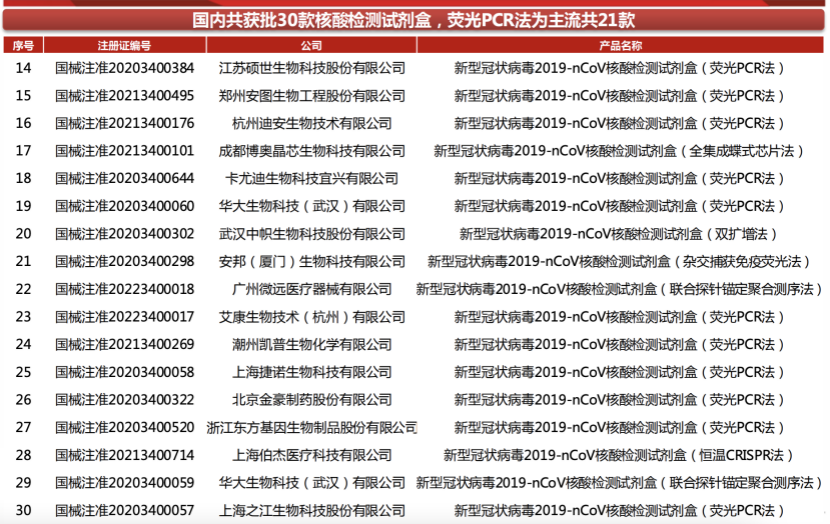 表1:國內獲批核酸(suan)檢(jian)測試劑盒(he)企(qi)業(ye)