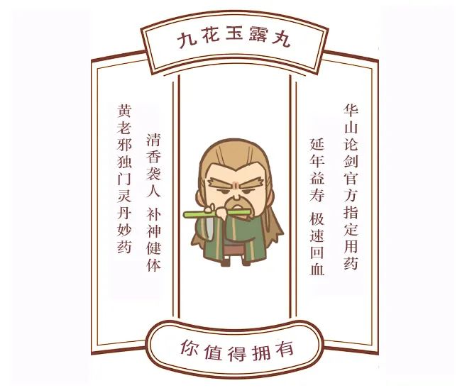 黃藥師顯然是制藥高手,他秘制的九花玉露丸具有很神奇的功效而被天下英雄推崇,那就是—可以益壽延年、補神健體。華山論劍時,五絕爭斗到脫力,癱在一起,黃藥師拿出九花玉露丸給大家猛“嗑”,嗑完全體急速“回血”后繼續打作一團去爭搶天下第一,從這個角度看,雖然九花玉露丸成分不詳,但是明顯有“興奮”的作用,小編認為極有可能含有麻黃堿、番木鱉堿甚至阿片類成分,雖然本來是滋補之物,但是筆者覺得還是要謹慎服用,尤其是運動員,要不然可能過不了尿檢那一關。