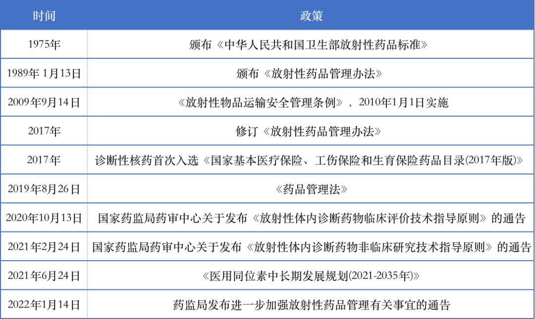 自(zi)1974年將核藥納入藥品管理以來,我國陸續出(chu)臺了多個政(zheng)策文件,促進核藥規(gui)范(fan)化、快速發展。