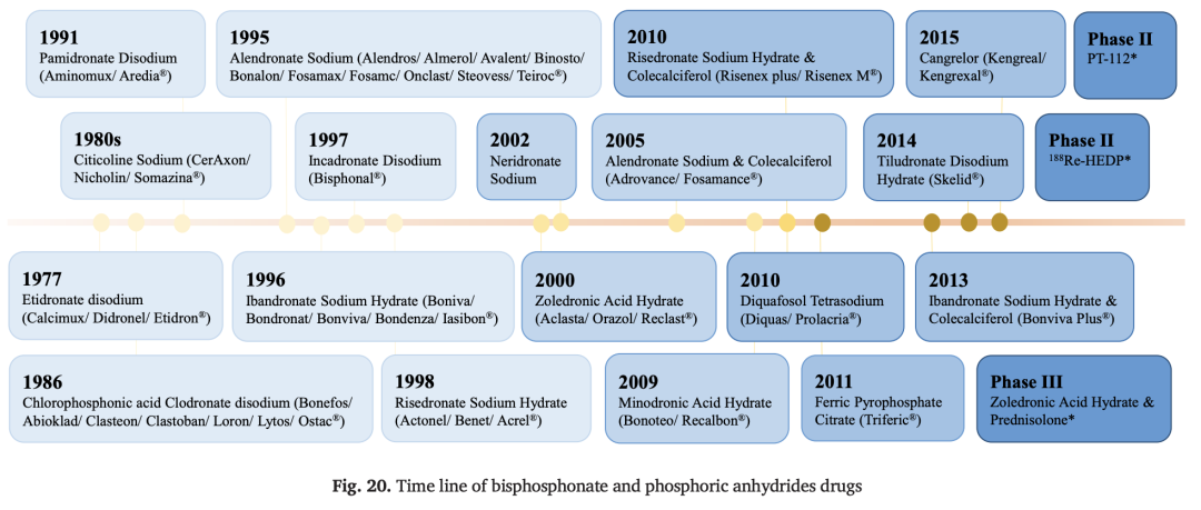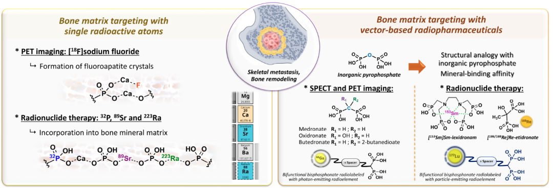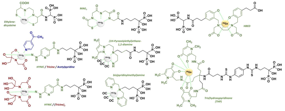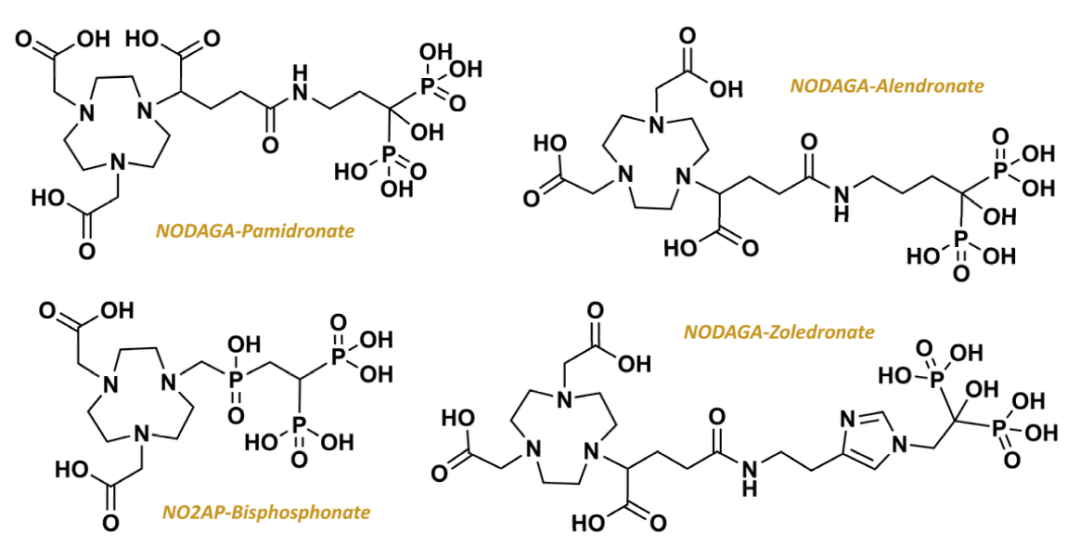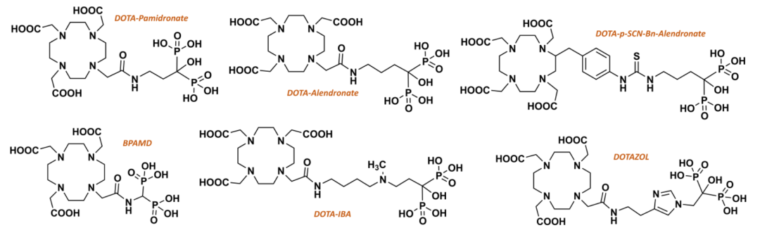 骨(gu)轉(zhuan)移(yi)(yi)又稱(cheng)為(wei)(wei)轉(zhuan)移(yi)(yi)性(xing)骨(gu)病(bing),是某些原發(fa)于骨(gu)組(zu)織以(yi)外(wai)的(de)(de)(de)(de)惡(e)性(xing)腫(zhong)(zhong)瘤(liu)(liu)經血(xue)行轉(zhuan)移(yi)(yi)至骨(gu)組(zu)織引起(qi)的(de)(de)(de)(de)以(yi)骨(gu)損害、疼痛為(wei)(wei)主(zhu)(zhu)要表現的(de)(de)(de)(de)疾病(bing),骨(gu)改(gai)良藥物(wu)(wu)是一(yi)(yi)類旨在緩解因骨(gu)轉(zhuan)移(yi)(yi)引起(qi)的(de)(de)(de)(de) SREs 藥物(wu)(wu)的(de)(de)(de)(de)總稱(cheng),目(mu)前主(zhu)(zhu)要包括雙(shuang)膦(lin)(lin)(lin)酸(suan)(suan)(suan)(suan)鹽(yan)(yan)(yan)類藥物(wu)(wu)和(he)(he) RANKL 抑制(zhi)劑(本文(wen)僅討論雙(shuang)膦(lin)(lin)(lin)酸(suan)(suan)(suan)(suan)鹽(yan)(yan)(yan)類藥物(wu)(wu))。在核(he)(he)(he)醫學(xue)中(zhong),使用最普(pu)遍的(de)(de)(de)(de)診斷(duan)(duan)核(he)(he)(he)藥99mTc標記的(de)(de)(de)(de)雙(shuang)膦(lin)(lin)(lin)酸(suan)(suan)(suan)(suan)鹽(yan)(yan)(yan)衍生物(wu)(wu),如(ru)全(quan)身核(he)(he)(he)素骨(gu)顯(xian)像劑亞(ya)(ya)甲基二磷酸(suan)(suan)(suan)(suan)鹽(yan)(yan)(yan)(99mTc‐MDP)和(he)(he)羥亞(ya)(ya)甲基二磷酸(suan)(suan)(suan)(suan)鹽(yan)(yan)(yan)(99mTc‐HMDP),已(yi)作為(wei)(wei)骨(gu)單光子發(fa)射(she)計算(suan)機(ji)斷(duan)(duan)層掃描(miao)(SPECT)成像劑使用了超過40年。這類診斷(duan)(duan)核(he)(he)(he)藥在腫(zhong)(zhong)瘤(liu)(liu)學(xue)和(he)(he)非(fei)腫(zhong)(zhong)瘤(liu)(liu)學(xue)領(ling)域都有廣泛(fan)應(ying)用,包括腫(zhong)(zhong)瘤(liu)(liu)分期、治療反(fan)應(ying)評估以(yi)及(ji)良性(xing)骨(gu)疾病(bing)的(de)(de)(de)(de)診斷(duan)(duan)。1968年第一(yi)(yi)個雙(shuang)膦(lin)(lin)(lin)酸(suan)(suan)(suan)(suan)鹽(yan)(yan)(yan)被(bei)報道;1977年,第一(yi)(yi)代的(de)(de)(de)(de)依替膦(lin)(lin)(lin)酸(suan)(suan)(suan)(suan)鈉(Etidronate)由(you)美國的(de)(de)(de)(de)寶潔(P&G)公司開(kai)發(fa)上(shang)市。基于依替膦(lin)(lin)(lin)酸(suan)(suan)(suan)(suan)鈉開(kai)發(fa)的(de)(de)(de)(de)治療性(xing)雙(shuang)膦(lin)(lin)(lin)酸(suan)(suan)(suan)(suan)鹽(yan)(yan)(yan)核(he)(he)(he)藥如(ru)[188Re]Re-Etidronate也已(yi)進(jin)行了臨床研究,顯(xian)示出一(yi)(yi)定的(de)(de)(de)(de)療效和(he)(he)改(gai)善患者生活質量(liang)的(de)(de)(de)(de)潛力。