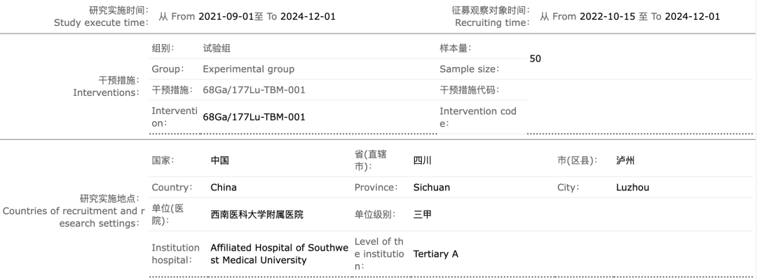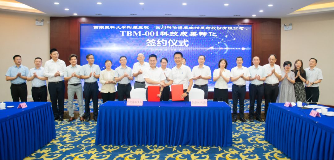 2021年11月,西南醫科大學附屬醫院核醫學科開發并完成了骨靶向核藥TBM-001的發明專利申請(CN114230610A已授權)、PCT國際專利申請(WO2023092830A1);2022年12月8日,四川科倫博泰生物醫藥股份有限公司與西南醫科大學附屬醫院在瀘州舉行了“生物靶向藥物國家工程研究中心”共建揭牌儀式暨工作推進會議,此次雙方成功轉化簽約,將促進我國鎵68/镥177診療一體化放射性藥物發展;2023年9月14日,西南醫科(ke)(ke)大(da)學附屬醫院(yuan)發明專利(li)(li)成果轉化簽(qian)約儀式(shi)(shi)成功舉行(xing),四川(chuan)科(ke)(ke)倫(lun)博泰生(sheng)(sheng)物醫藥股(gu)份有限公(gong)司(si)向西南醫科(ke)(ke)大(da)學附屬醫院(yuan)支付合同首付款及開發里程碑共計3850萬元獲得TBM-001項目(mu)的全球獨家權益,包括在全球范(fan)圍(wei)內開展項目(mu)的研究、開發、生(sheng)(sheng)產、商業化推廣(guang)以及全球的分(fen)許可權利(li)(li),瀘州市人民政府副(fu)市長羅素平,西南醫科(ke)(ke)大(da)學副(fu)校長聶敏海,科(ke)(ke)倫(lun)集團董事(shi)長劉革新,科(ke)(ke)倫(lun)博泰總經理(li)葛均友,西南醫科(ke)(ke)大(da)學附屬醫院(yuan)書(shu)記徐勇、院(yuan)長江涌等出席此次簽(qian)約儀式(shi)(shi)。