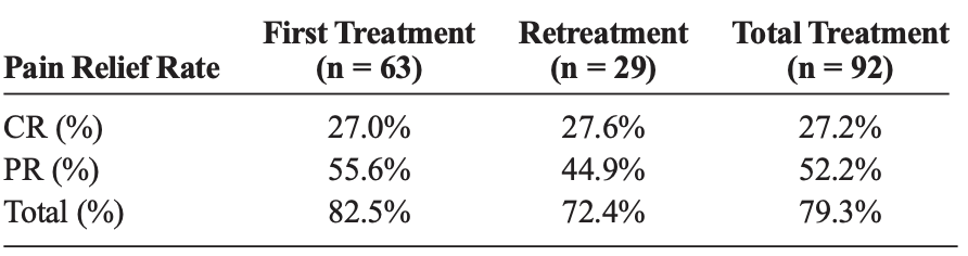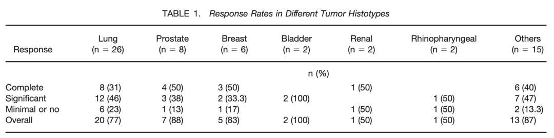 2001年的(de)(de)(de)一(yi)項臨床研究包(bao)括61名(ming)患(huan)(huan)(huan)有(you)肺癌、前列(lie)腺(xian)癌、乳腺(xian)癌、腎(shen)癌、鼻(bi)咽癌和(he)膀胱(guang)癌等不(bu)同類型(xing)(xing)晚期癌癥的(de)(de)(de)患(huan)(huan)(huan)者(zhe),這(zhe)些患(huan)(huan)(huan)者(zhe)接(jie)受(shou)了(le)(le)1.1GBq(31mCi)到(dao)6.9GBq(188mCi)的(de)(de)(de)188Re- HEDP治(zhi)療(liao)(liao)。治(zhi)療(liao)(liao)后(hou),患(huan)(huan)(huan)者(zhe)在最初的(de)(de)(de)兩個月內(nei)每周(zhou)接(jie)受(shou)一(yi)次(ci)隨訪,之后(hou)每月隨訪一(yi)次(ci),最長隨訪時間為(wei)1年。此(ci)外,該(gai)研究在治(zhi)療(liao)(liao)前后(hou)6周(zhou)內(nei)還(huan)進(jin)行了(le)(le)血(xue)液功能測試(shi)。疼痛(tong)反(fan)應根據三點疼痛(tong)評分(fen)量表(完全緩(huan)解、顯著緩(huan)解和(he)最小(xiao)緩(huan)解)進(jin)行評估(gu)。研究結果顯示,總(zong)體上80%的(de)(de)(de)患(huan)(huan)(huan)者(zhe)在治(zhi)療(liao)(liao)后(hou)迅(xun)速且顯著地緩(huan)解了(le)(le)骨(gu)痛(tong)。具體到(dao)不(bu)同腫瘤類型(xing)(xing),肺癌患(huan)(huan)(huan)者(zhe)中(zhong)(zhong)(zhong)77%、前列(lie)腺(xian)癌患(huan)(huan)(huan)者(zhe)中(zhong)(zhong)(zhong)80%、乳腺(xian)癌患(huan)(huan)(huan)者(zhe)中(zhong)(zhong)(zhong)83%、膀胱(guang)癌患(huan)(huan)(huan)者(zhe)中(zhong)(zhong)(zhong)100%、腎(shen)癌患(huan)(huan)(huan)者(zhe)中(zhong)(zhong)(zhong)50%、鼻(bi)咽癌患(huan)(huan)(huan)者(zhe)中(zhong)(zhong)(zhong)50%以及(ji)其他腫瘤類型(xing)(xing)患(huan)(huan)(huan)者(zhe)中(zhong)(zhong)(zhong)87%的(de)(de)(de)疼痛(tong)得(de)到(dao)了(le)(le)緩(huan)解,且未出現嚴重的(de)(de)(de)副作(zuo)用或血(xue)液毒性。總(zong)之,這(zhe)項大規(gui)模(mo)臨床試(shi)驗驗證了(le)(le)Re-188 HEDP作(zuo)為(wei)一(yi)種(zhong)(zhong)有(you)效(xiao)的(de)(de)(de)放射性藥物,在治(zhi)療(liao)(liao)各種(zhong)(zhong)腫瘤類型(xing)(xing)引起(qi)的(de)(de)(de)疼痛(tong)性骨(gu)轉移(yi)方面具有(you)顯著療(liao)(liao)效(xiao)。