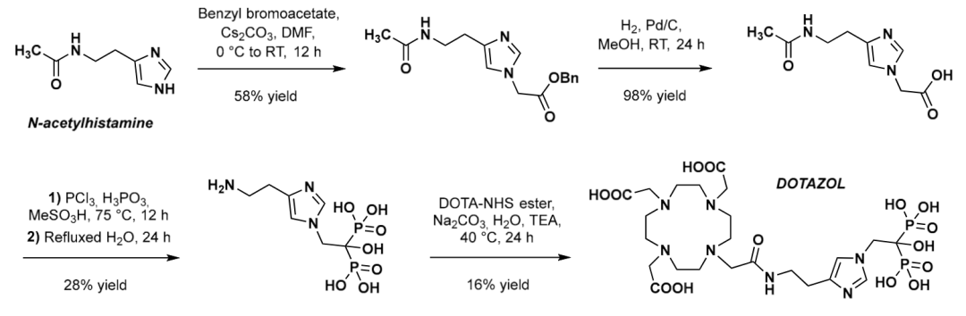 唑來膦酸(zoledronicacid)是繼帕米膦酸二鈉(pamidronate)之后的第3代二膦酸鹽類(diphosphonates)藥物注射用唑來膦酸濃溶液由諾華公司開發,于2000年首次在加拿大上市,2001年8月首次在美國獲批上市,2008年原研藥品在我國獲批上市,目前已在歐盟、美國等80多個國家廣泛使用,基于此開發的放射性藥物便是177Lu-DOTA-唑來膦酸 ( 177Lu-DOTA-ZOL),上圖為Meckel等人(Frank Rösch教授為通訊作者)在2017年發表的關于DOTAZOL的合成路線。