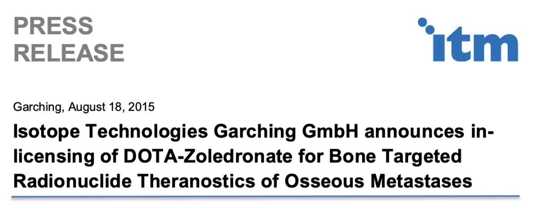 2015年8月,ITM集團宣布其子公司ITG GmbH成功引進了DOTA-Zoledronate這種用于骨靶向放射性核素治療和診斷骨轉移的藥物,將其孵化至商業化市場;2021年12月27日,遠大醫藥(512.HK)集團與德國ITM Isotope Technologies Munich SE達成產品戰略合作,遠大醫藥將按照產品審批進度和銷售情況,支付不超過5.2億歐元的授權簽約費及里程碑款項,以獲得ITM公司開發的3款全球創新型放射性核素偶聯藥物(RDC)在大中華區(中國大陸、香港、澳門、臺灣)的獨家開發、生產及商業化權益,包含這款用于治療惡性腫瘤骨轉移的ITM-41(177Lu-zoledronate);2022年02月,遠大醫(yi)藥(yao)與(yu)德國ITM 訂立股(gu)權投(tou)資協議,以2,500萬歐元認(ren)購(gou)ITM公(gong)司的新股(gu)份,等于其擴大后股(gu)本的約1.31%。此次股(gu)權投(tou)資將會進一步加深遠大醫(yi)藥(yao)與(yu)ITM公(gong)司的戰略合(he)作(zuo),為(wei)公(gong)司在全球(qiu)進行放射性核素藥(yao)品的產、研(yan)、銷(xiao)之(zhi)全產業鏈布局奠定了(le)堅實的基(ji)礎。