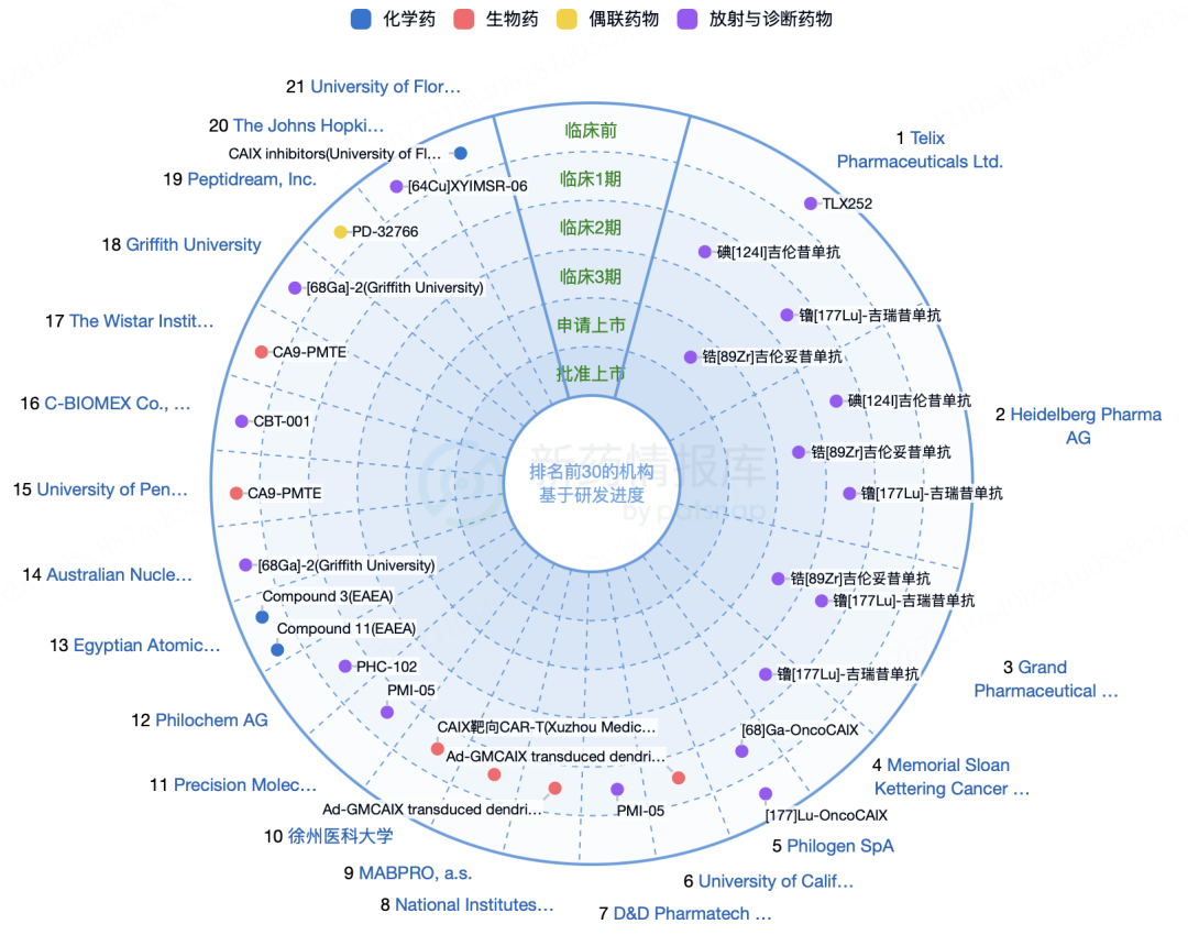在(zai)CAIX靶(ba)(ba)點診(zhen)療(liao)(liao)一體化開發(fa)(fa)領(ling)域,全球藥(yao)企已形成"診(zhen)斷先(xian)行、治(zhi)療(liao)(liao)突破"的(de)(de)戰(zhan)略布局格(ge)局。隨著診(zhen)斷核(he)藥(yao)TLX250-CDx(89Zr標(biao)記)進(jin)入FDA上(shang)市(shi)審評倒計(ji)時,治(zhi)療(liao)(liao)性(xing)核(he)藥(yao)研發(fa)(fa)競(jing)賽已進(jin)入白熱(re)化階段。一方面,Debiopharm的(de)(de)68Ga/177Lu-DPI-4452憑借其(qi)卓(zhuo)越的(de)(de)靶(ba)(ba)向(xiang)性(xing)和臨(lin)床潛力(li)(li),率(lv)先(xian)搶占了治(zhi)療(liao)(liao)性(xing)環肽(tai)核(he)藥(yao)的(de)(de)賽道;另一方面,PeptiDream開發(fa)(fa)的(de)(de)PD-32766以(yi)及國內團隊研發(fa)(fa)的(de)(de)[177Lu]Lu-XYIMSR-01也緊(jin)隨其(qi)后,展(zhan)現(xian)出(chu)強(qiang)勁的(de)(de)競(jing)爭力(li)(li)。核(he)藥(yao)企業們正加(jia)速布局CAIX靶(ba)(ba)點治(zhi)療(liao)(liao)賽道,全力(li)(li)開展(zhan)靶(ba)(ba)向(xiang)性(xing)治(zhi)療(liao)(liao)核(he)藥(yao)的(de)(de)開發(fa)(fa)工作,競(jing)相爭奪首款治(zhi)療(liao)(liao)性(xing)核(he)藥(yao)產(chan)品的(de)(de)研發(fa)(fa)先(xian)機,這將不僅(jin)是技(ji)術實力(li)(li)的(de)(de)較量,更是一場戰(zhan)略布局和推進(jin)速度的(de)(de)比(bi)拼,期(qi)待未來的(de)(de)突破進(jin)展(zhan)。