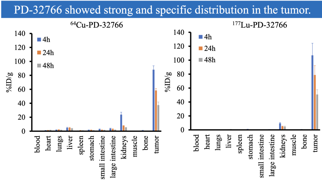 此(ci)前披露的(de)(de)數(shu)據顯(xian)示,PD-32766、63Cu-PD-32766 和(he)(he) 175Lu-PD-32766 (natCu、natLu)對(dui)CA9的(de)(de)親(qin)和(he)(he)力小于(yu)0.2 nM。在體內(nei)生(sheng)物分布實驗中(zhong),64Cu-PD-32766 和(he)(he) 177Lu-PD-32766 在給(gei)藥后(hou)4小時(shi)在腫(zhong)(zhong)瘤(liu)中(zhong)表現出特(te)異性的(de)(de)高攝取(qu)(64Cu-PD-32766 和(he)(he) 177Lu-PD-32766 分別(bie)(bie)為 88% 和(he)(he) 107% ID/g),并且在給(gei)藥后(hou) 48 小時(shi)在腫(zhong)(zhong)瘤(liu)中(zhong)持續高保(bao)留(64Cu-PD-32766 和(he)(he) 177Lu-PD-32766 分別(bie)(bie)為 37% 和(he)(he) 51% ID/g)。其他正(zheng)常組織中(zhong)的(de)(de)最(zui)大攝取(qu)分別(bie)(bie)為 23% ID/g 和(he)(he) 9%ID/g(4小時(shi)后(hou)64Cu-PD-32766和(he)(he) 177Lu-PD-32766 的(de)(de)腫(zhong)(zhong)瘤(liu)/腎臟比為3.8和(he)(he)11.9)。在治(zhi)療實驗中(zhong),177Lu-PD-32766(30 MBq/小鼠單(dan)次或(huo)QW x3)具有良好的(de)(de)耐受性,與(yu)對(dui)照組相比,給(gei)藥后(hou)45天的(de)(de)小鼠存活率(lv)顯(xian)著提高,這表明(ming)177Lu-PD-32766具有強大的(de)(de)腫(zhong)(zhong)瘤(liu)生(sheng)長抑制作用。