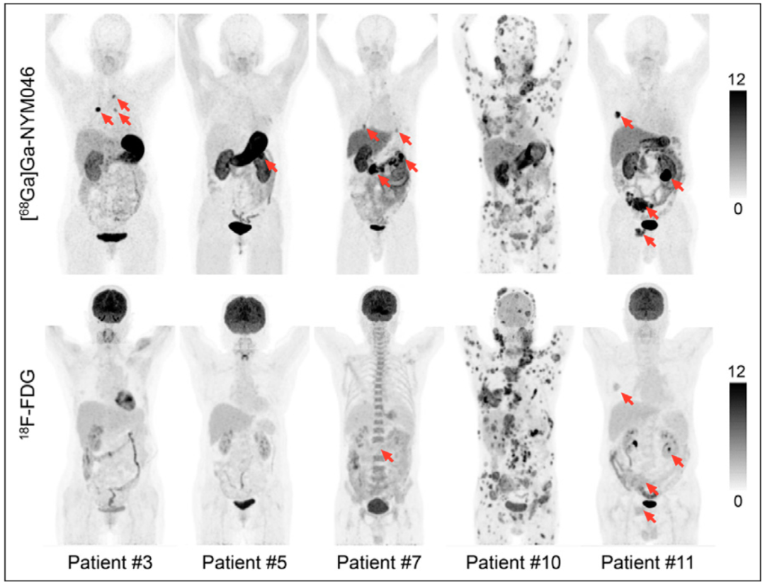 本(ben)圖展示了5名患(huan)者(zhe)(zhe)(患(huan)者(zhe)(zhe)3、5、7、10和11)的代(dai)表性(xing)最大強度投影(maximum-intensity projections,MIPs)圖像(xiang),這(zhe)些圖像(xiang)比較了[68Ga]Ga-NYM046 PET/CT和18F-FDG PET/CT的結果。在(zai)這(zhe)些圖像(xiang)中,兩種(zhong)示蹤劑都顯示了在(zai)骨骼和淋巴(ba)結轉移中的特(te)異性(xing)攝(she)取(qu)(患(huan)者(zhe)(zhe)10和11),[68Ga]Ga-NYM046 PET/CT在(zai)檢測原發腫(zhong)瘤、肺轉移和胸膜轉移方面(mian)的表現優(you)于18F-FDG PET/CT(患(huan)者(zhe)(zhe)3、5、7和11)。