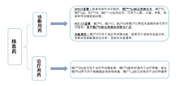 核(he)(he)藥是(shi)通(tong)過高(gao)度選(xuan)擇性(xing)聚集在(zai)病變部位的(de)放射(she)性(xing)核(he)(he)素或其標記化合物所發射(she)出的(de)射(she)程(cheng)很短的(de)核(he)(he)射(she)線,對病變部位進行內(nei)照射(she)治(zhi)(zhi)(zhi)療(liao)。目前臨床(chuang)應用非(fei)常廣泛,其中診斷應用包括(kuo)(kuo)腫瘤顯(xian)像(xiang)、心腦血管(guan)、神經(jing)、骨 骼、內(nei)分(fen)泌、泌尿、消(xiao)化、呼吸、造血與淋(lin)巴(ba)等(deng)多個(ge)系(xi)統的(de)顯(xian)像(xiang)診斷;治(zhi)(zhi)(zhi)療(liao)應用包括(kuo)(kuo)甲狀腺疾(ji)病、腫瘤治(zhi)(zhi)(zhi)療(liao)、靶向治(zhi)(zhi)(zhi)療(liao)等(deng)等(deng)。