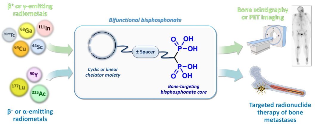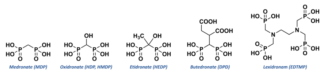 骨(gu)轉(zhuan)移(yi)(yi)又稱(cheng)為(wei)(wei)轉(zhuan)移(yi)(yi)性(xing)骨(gu)病(bing),是某些原發(fa)于骨(gu)組(zu)織以(yi)外(wai)的(de)(de)(de)(de)惡(e)性(xing)腫(zhong)(zhong)瘤(liu)(liu)經血(xue)行轉(zhuan)移(yi)(yi)至骨(gu)組(zu)織引起(qi)的(de)(de)(de)(de)以(yi)骨(gu)損害、疼痛為(wei)(wei)主(zhu)(zhu)要表現的(de)(de)(de)(de)疾病(bing),骨(gu)改(gai)良藥物(wu)(wu)是一(yi)(yi)類旨在緩解因骨(gu)轉(zhuan)移(yi)(yi)引起(qi)的(de)(de)(de)(de) SREs 藥物(wu)(wu)的(de)(de)(de)(de)總稱(cheng),目(mu)前主(zhu)(zhu)要包括雙(shuang)膦(lin)(lin)(lin)酸(suan)(suan)(suan)(suan)鹽(yan)(yan)(yan)類藥物(wu)(wu)和(he)(he) RANKL 抑制(zhi)劑(本文(wen)僅討論雙(shuang)膦(lin)(lin)(lin)酸(suan)(suan)(suan)(suan)鹽(yan)(yan)(yan)類藥物(wu)(wu))。在核(he)(he)(he)醫學(xue)中(zhong),使用最普(pu)遍的(de)(de)(de)(de)診斷(duan)(duan)核(he)(he)(he)藥99mTc標記的(de)(de)(de)(de)雙(shuang)膦(lin)(lin)(lin)酸(suan)(suan)(suan)(suan)鹽(yan)(yan)(yan)衍生物(wu)(wu),如(ru)全(quan)身核(he)(he)(he)素骨(gu)顯(xian)像劑亞(ya)(ya)甲基二磷酸(suan)(suan)(suan)(suan)鹽(yan)(yan)(yan)(99mTc‐MDP)和(he)(he)羥亞(ya)(ya)甲基二磷酸(suan)(suan)(suan)(suan)鹽(yan)(yan)(yan)(99mTc‐HMDP),已(yi)作為(wei)(wei)骨(gu)單光子發(fa)射(she)計算(suan)機(ji)斷(duan)(duan)層掃描(miao)(SPECT)成像劑使用了超過40年。這類診斷(duan)(duan)核(he)(he)(he)藥在腫(zhong)(zhong)瘤(liu)(liu)學(xue)和(he)(he)非(fei)腫(zhong)(zhong)瘤(liu)(liu)學(xue)領(ling)域都有廣泛(fan)應(ying)用,包括腫(zhong)(zhong)瘤(liu)(liu)分期、治療反(fan)應(ying)評估以(yi)及(ji)良性(xing)骨(gu)疾病(bing)的(de)(de)(de)(de)診斷(duan)(duan)。1968年第一(yi)(yi)個雙(shuang)膦(lin)(lin)(lin)酸(suan)(suan)(suan)(suan)鹽(yan)(yan)(yan)被(bei)報道;1977年,第一(yi)(yi)代的(de)(de)(de)(de)依替膦(lin)(lin)(lin)酸(suan)(suan)(suan)(suan)鈉(Etidronate)由(you)美國的(de)(de)(de)(de)寶潔(P&G)公司開(kai)發(fa)上(shang)市。基于依替膦(lin)(lin)(lin)酸(suan)(suan)(suan)(suan)鈉開(kai)發(fa)的(de)(de)(de)(de)治療性(xing)雙(shuang)膦(lin)(lin)(lin)酸(suan)(suan)(suan)(suan)鹽(yan)(yan)(yan)核(he)(he)(he)藥如(ru)[188Re]Re-Etidronate也已(yi)進(jin)行了臨床研究,顯(xian)示出一(yi)(yi)定的(de)(de)(de)(de)療效和(he)(he)改(gai)善患者生活質量(liang)的(de)(de)(de)(de)潛力。
