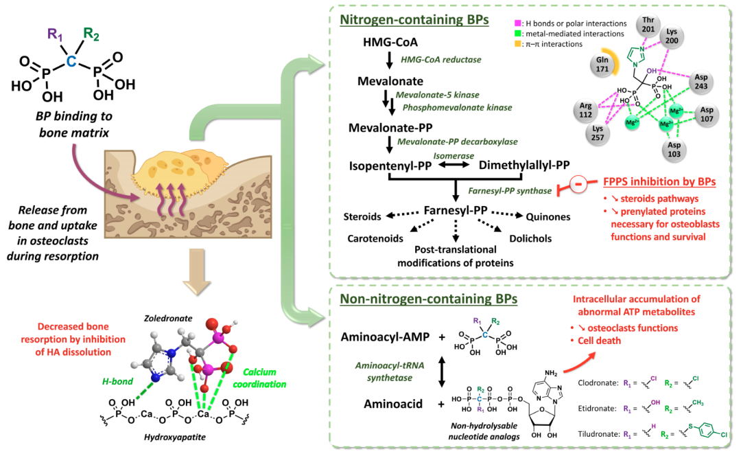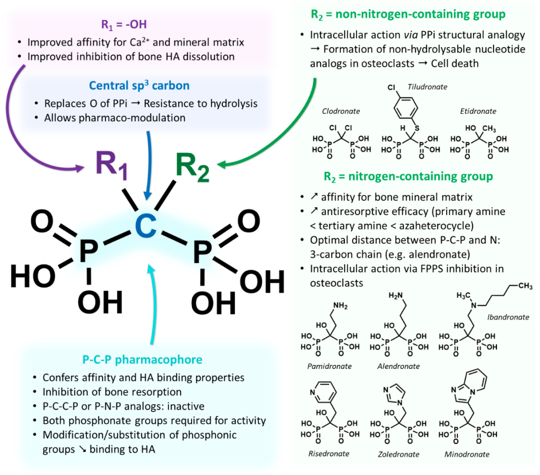 雙(shuang)(shuang)膦(lin)(lin)酸(suan)(suan)(suan)(suan)(suan)鹽(yan)分(fen)子(zi)(zi)中P-C-P結構是其產生(sheng)抑(yi)(yi)制(zhi)骨(gu)吸收(shou)(shou)活性的(de)(de)(de)(de)必要條(tiao)件。雙(shuang)(shuang)膦(lin)(lin)酸(suan)(suan)(suan)(suan)(suan)鹽(yan)分(fen)子(zi)(zi)中磷(lin)酸(suan)(suan)(suan)(suan)(suan)根上的(de)(de)(de)(de)氧原(yuan)子(zi)(zi)能與鈣離子(zi)(zi)螯合(he),形成二(er)配位體從而(er)抑(yi)(yi)制(zhi)骨(gu)吸收(shou)(shou)。雙(shuang)(shuang)膦(lin)(lin)酸(suan)(suan)(suan)(suan)(suan)鹽(yan)類藥(yao)物的(de)(de)(de)(de)藥(yao)效強度取(qu)(qu)決(jue)于各藥(yao)的(de)(de)(de)(de)碳原(yuan)子(zi)(zi)上取(qu)(qu)代(dai)側(ce)鏈(lian)的(de)(de)(de)(de)類型,即C原(yuan)子(zi)(zi)上的(de)(de)(de)(de)R1和R2側(ce)鏈(lian)取(qu)(qu)代(dai)基(ji)(ji)(上圖所示(shi)),R1側(ce)鏈(lian)取(qu)(qu)代(dai)基(ji)(ji)主要參與雙(shuang)(shuang)膦(lin)(lin)酸(suan)(suan)(suan)(suan)(suan)鹽(yan)與骨(gu)基(ji)(ji)質(zhi)中的(de)(de)(de)(de)羥基(ji)(ji)磷(lin)灰石的(de)(de)(de)(de)結合(he),決(jue)定(ding)了雙(shuang)(shuang)膦(lin)(lin)酸(suan)(suan)(suan)(suan)(suan)鹽(yan)分(fen)子(zi)(zi)在(zai)體內(nei)(nei)能否迅速而(er)選擇性地結合(he)到骨(gu)基(ji)(ji)質(zhi)表面。R2側(ce)鏈(lian)取(qu)(qu)代(dai)基(ji)(ji)對雙(shuang)(shuang)膦(lin)(lin)酸(suan)(suan)(suan)(suan)(suan)鹽(yan)類藥(yao)物抗骨(gu)質(zhi)吸收(shou)(shou)的(de)(de)(de)(de)強度起著重要作用(yong)。一些雙(shuang)(shuang)膦(lin)(lin)酸(suan)(suan)(suan)(suan)(suan)鹽(yan)如第一代(dai)的(de)(de)(de)(de)依替(ti)膦(lin)(lin)酸(suan)(suan)(suan)(suan)(suan)鈉(Etidronate)和氯屈膦(lin)(lin)酸(suan)(suan)(suan)(suan)(suan)鈉(Clodronate)被破(po)骨(gu)細(xi)胞(bao)攝取(qu)(qu)后代(dai)謝(xie)為非水解的(de)(de)(de)(de)具有潛(qian)在(zai)細(xi)胞(bao)毒(du)性的(de)(de)(de)(de)腺苷三(san)磷(lin)酸(suan)(suan)(suan)(suan)(suan) (adenosine triphosphate, ATP) 類似物,并在(zai)細(xi)胞(bao)內(nei)(nei)大量堆積,使得ATP不能作為能量來(lai)源,從而(er)抑(yi)(yi)制(zhi)許多細(xi)胞(bao)內(nei)(nei)代(dai)謝(xie)性相關蛋白酶,對破(po)骨(gu)細(xi)胞(bao)的(de)(de)(de)(de)生(sheng)長起到抑(yi)(yi)制(zhi)作用(yong),促進破(po)骨(gu)細(xi)胞(bao)凋亡,而(er)達到抑(yi)(yi)制(zhi)骨(gu)吸收(shou)(shou)的(de)(de)(de)(de)作用(yong)。