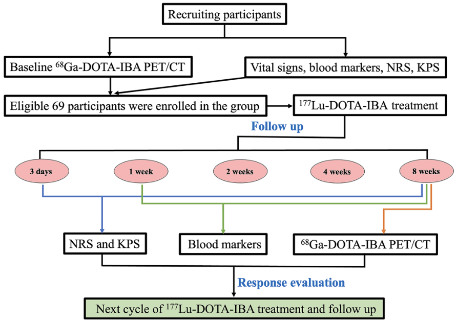 這項研究(ChiCTR2200064487)為單中心、單臂(bei)、前(qian)瞻性臨(lin)床研究,于2021年11月(yue)至2023年2月(yue)進(jin)行。研究納(na)入(ru)年齡(ling)≥18歲、經組織學證實(shi)的(de)(de)惡(e)性腫瘤且通過99mTc-MDP骨(gu)掃描確認的(de)(de)多發骨(gu)轉(zhuan)移患(huan)者,要求治(zhi)(zhi)(zhi)療(liao)(liao)前(qian)4周(zhou)內未接(jie)受放化(hua)療(liao)(liao),且預計(ji)生存期(qi)至少(shao)3個月(yue)。排除標(biao)準包(bao)括99mTc-MDP骨(gu)掃描呈超掃描現(xian)象(xiang)、脊髓(sui)壓迫或(huo)(huo)病理性骨(gu)折(zhe)、合并DIC或(huo)(huo)嚴重骨(gu)髓(sui)造血功能障礙以(yi)及妊(ren)娠或(huo)(huo)哺(bu)乳期(qi)。治(zhi)(zhi)(zhi)療(liao)(liao)時,靜(jing)脈注射370-2590 MBq的(de)(de)177Lu-DOTA-IBA,并進(jin)行生理鹽(yan)水沖洗(xi)。治(zhi)(zhi)(zhi)療(liao)(liao)后(hou),密切(qie)監測患(huan)者的(de)(de)生命體征(zheng)和(he)(he)一般狀況,包(bao)括疲勞、發熱、惡(e)心、嘔吐、腹瀉(xie)和(he)(he)食欲變化(hua)等。在治(zhi)(zhi)(zhi)療(liao)(liao)后(hou)3天、1周(zhou)、2周(zhou)、4周(zhou)和(he)(he)8周(zhou)評估(gu)KPS和(he)(he)疼(teng)痛評分,1、2、4和(he)(he)8周(zhou)評估(gu)血液生物標(biao)志物。治(zhi)(zhi)(zhi)療(liao)(liao)后(hou)8周(zhou)進(jin)行68Ga-DOTA-IBA PET/CT評估(gu)影像學反應(ying)。根據患(huan)者的(de)(de)意愿和(he)(he)臨(lin)床情況決定(ding)后(hou)續治(zhi)(zhi)(zhi)療(liao)(liao)。