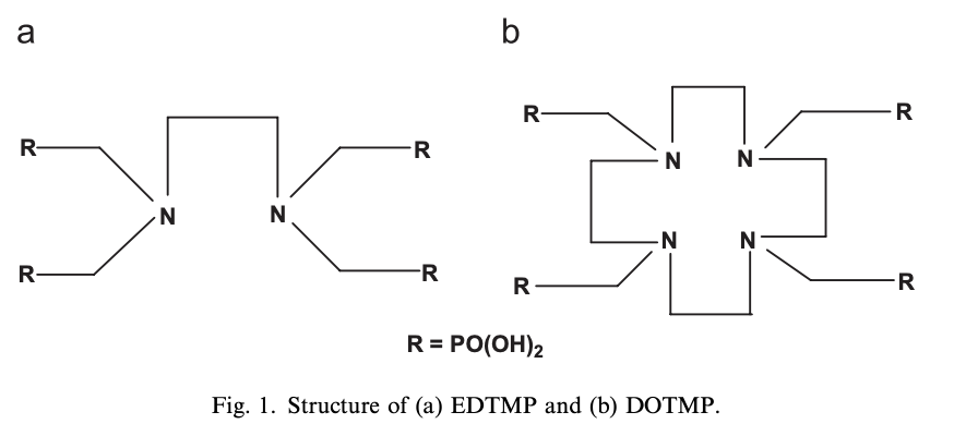 自20世紀80年代末以來,一種與乙二胺四甲基膦酸鹽(EDTMP)相關的雙膦酸鹽衍生物,被用153Sm (t1/2 = 1.9days; Eβ-max = 0.81MeV) 放射性核素標記,用于緩解由骨轉移引起的疼痛。兩項臨床試驗表明,與安慰劑相比,這種標記的雙膦酸鹽在緩解疼痛方面有效,并且與89Sr和32P相比,其毒性特征有所改善,這表明153Sm-EDTMP作為一種放射性藥物,在骨轉移疼痛管理中顯示出一定的療效和安全性,為患者提供了一種治療選擇。Ethylenediaminetetramethylene phosphonic acid (EDTMP) 與1,4,7,10-tetraazacyclododecane-1,4,7,10-tetramethylene phosphonic acid (DOTMP) 屬于不同的螯合劑,都是多氨基磷酸類配體,以此開發的核藥分別為153Sm-EDTMP與153Sm-DOTMP。EDTMP是線性配體,而DOTMP是環狀配體,二者在結構、性質和應用上有顯著區別,DOTMP相較于EDTMP而言,與放射性金屬離子結合時更為穩定,主要用于放射性藥物的制備,特別是在骨靶向治療和診斷中;在生物分布上,兩者都濃聚在骨組織,但 DOTMP 的血液清除速度比 EDTMP 快,153Sm-DOTMP已在臨床前和早期臨床試驗中顯示出安全性、有效性。