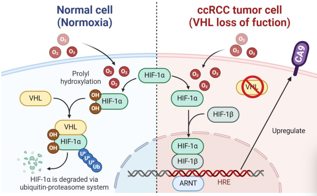 CAIX(碳酸酐酶IX)是一種由459個氨基酸殘基構成的跨膜蛋白,作為腫瘤相關酶在多種惡性腫瘤中特異性高表達。其表達受HIF-1α信號通路調控,尤其在腫瘤低氧微環境中呈現顯著上調特征。該酶通過催化二氧化碳水合作用參與細胞pH穩態調節,其異常活化可促進腫瘤細胞在酸性微環境中的適應性生存與增殖。在透明細胞腎細胞癌(ccRCC)中,約90%的病例因VHL基因缺失導致HIF-1α持續性核內蓄積,繼而引發CAIX的異常高表達。這種分子級聯反應不僅引起細胞外微環境酸化,更通過干擾細胞黏附信號通路促進腫瘤細胞脫離原發灶,顯著增強其侵襲轉移潛能。盡管CAIX已被國際學界公認為腎癌診療的關鍵分子靶點,但截至目前,全球范圍內尚未有靶向該蛋白的臨床治療藥物獲批上市,這一現(xian)狀(zhuang)凸顯了該領域藥物研發的迫(po)切需求與重要研究價值。