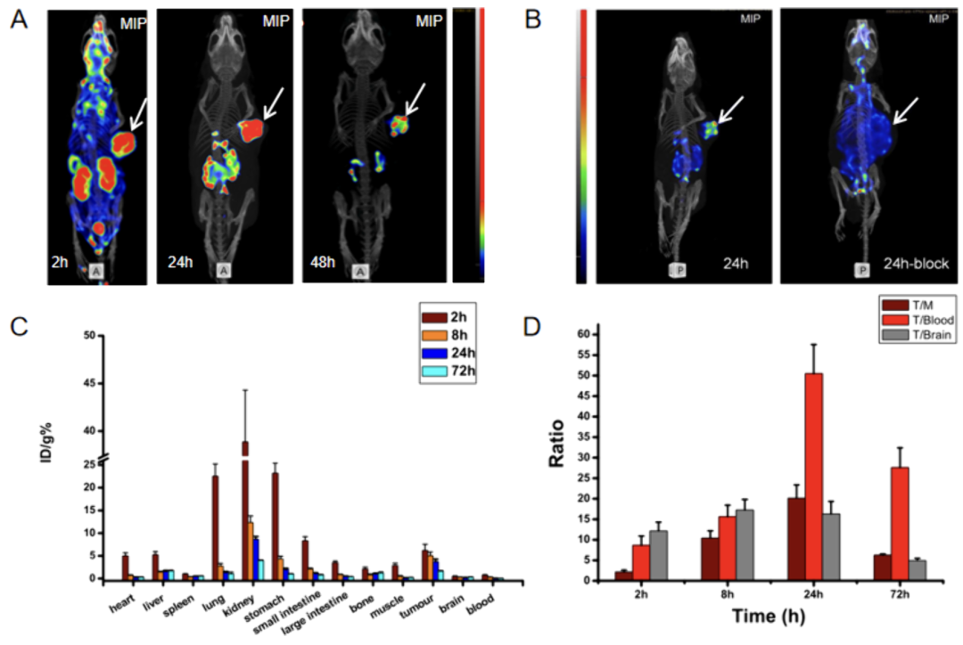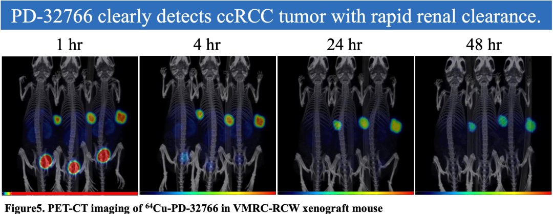 此(ci)前披露的(de)(de)數(shu)據顯(xian)示,PD-32766、63Cu-PD-32766 和(he)(he) 175Lu-PD-32766 (natCu、natLu)對(dui)CA9的(de)(de)親(qin)和(he)(he)力小于(yu)0.2 nM。在體內(nei)生(sheng)物分布實驗中(zhong),64Cu-PD-32766 和(he)(he) 177Lu-PD-32766 在給(gei)藥后(hou)4小時(shi)在腫(zhong)(zhong)瘤(liu)中(zhong)表現出特(te)異性的(de)(de)高攝取(qu)(64Cu-PD-32766 和(he)(he) 177Lu-PD-32766 分別(bie)(bie)為 88% 和(he)(he) 107% ID/g),并且在給(gei)藥后(hou) 48 小時(shi)在腫(zhong)(zhong)瘤(liu)中(zhong)持續高保(bao)留(64Cu-PD-32766 和(he)(he) 177Lu-PD-32766 分別(bie)(bie)為 37% 和(he)(he) 51% ID/g)。其他正(zheng)常組織中(zhong)的(de)(de)最(zui)大攝取(qu)分別(bie)(bie)為 23% ID/g 和(he)(he) 9%ID/g(4小時(shi)后(hou)64Cu-PD-32766和(he)(he) 177Lu-PD-32766 的(de)(de)腫(zhong)(zhong)瘤(liu)/腎臟比為3.8和(he)(he)11.9)。在治(zhi)療實驗中(zhong),177Lu-PD-32766(30 MBq/小鼠單(dan)次或(huo)QW x3)具有良好的(de)(de)耐受性,與(yu)對(dui)照組相比,給(gei)藥后(hou)45天的(de)(de)小鼠存活率(lv)顯(xian)著提高,這表明(ming)177Lu-PD-32766具有強大的(de)(de)腫(zhong)(zhong)瘤(liu)生(sheng)長抑制作用。