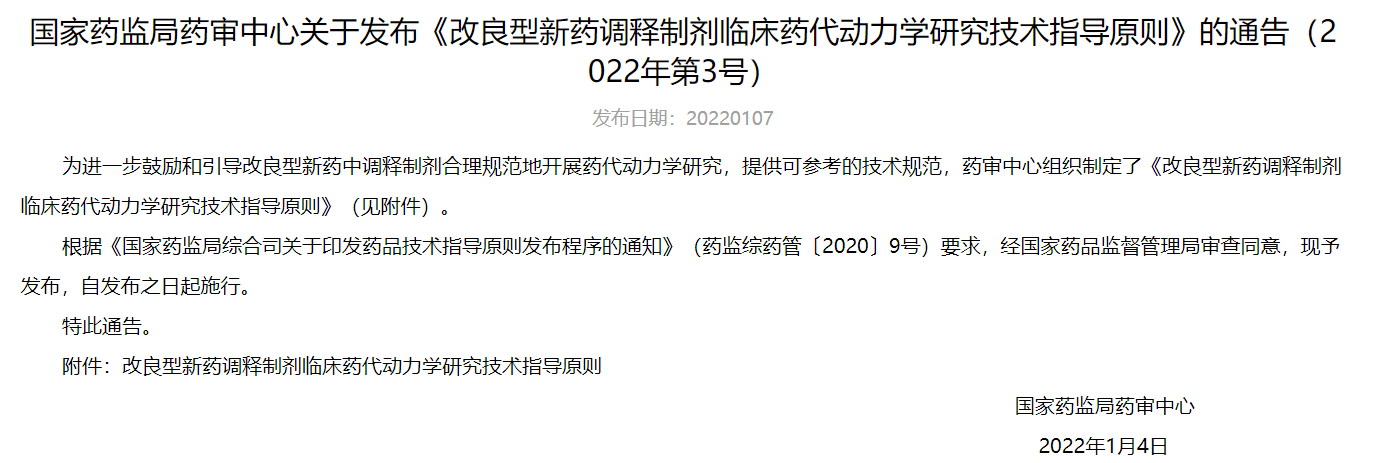 國家藥監局藥審中心關于發布《改良型新藥調釋制劑臨床藥代動力學研究技術指導原則》的通告(2022年第3號)
